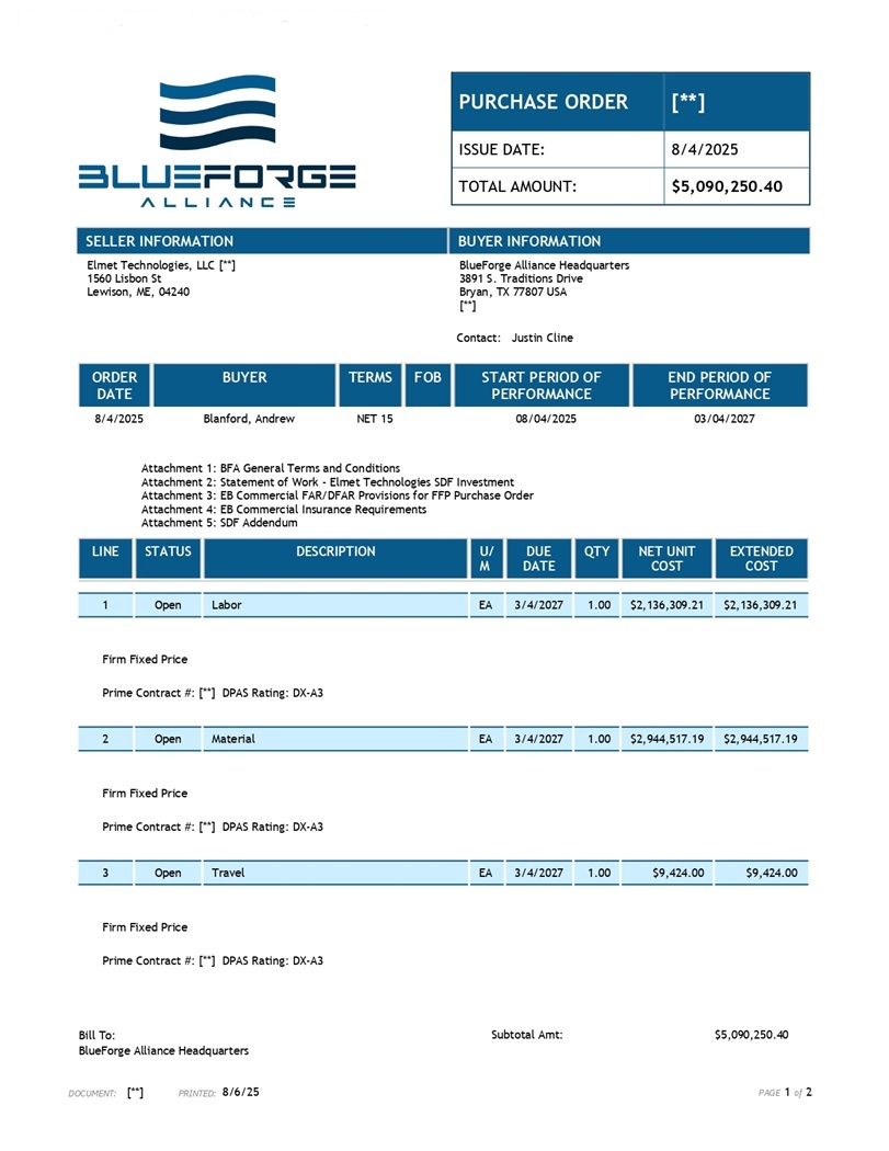PURCHASE ORDER [**] ISSUE DATE: 8/4/2025 $5,090,250.40 TOTAL AMOUNT: E 8/4/2025 Blanford, Andrew NET 15 08/04/2025 03/04/2027 Attachment 1: BFA General Terms and Conditions Attachment 2: Statement of Work - Elmet Technologies SDF Investment Attachment 3: EB Commercial FAR/DFAR Provisions for FFP Purchase Order Attachment 4: EB Commercial Insurance Requirements Attachment 5: SDF Addendum EXTENDED COST NET UNIT COST QTY DUE DATE U/ M DESCRIPTION STATUS LINE nvelope ID: DF7F8AAB - 40A7 - 429B - 805A - 6B0007B37CC5 SELLER INFORMATION BUYER INFORMATION Elmet Technologies, LLC [**] BlueForge Alliance Headquarters 1560 Lisbon St 3891 S. Traditions Drive Lewison, ME, 04240 Bryan, TX 77807 USA [**] Contact: Justin Cline END PERIOD OF PERFORMANCE START PERIOD OF PERFORMANCE FOB TERMS BUYER ORDER DATE 1 Open Labor EA 3/4/2027 1.00 $2,136,309.21 $2,136,309.21 Firm Fixed Price Prime Contract #: [**] DPAS Rating: DX - A3 2 Open Material EA 3/4/2027 1.00 $2,944,517.19 $2,944,517.19 Firm Fixed Price Prime Contract #: [**] DPAS Rating: DX - A3 3 Open Travel EA 3/4/2027 1.00 $9,424.00 $9,424.00 Firm Fixed Price Prime Contract #: [**] DPAS Rating: DX - A3 Bill To: BlueForge Alliance Headquarters Subtotal Amt: $5,090,250.40 Docusign DOCUMENT: [**] PRINTED: 8/6/25 PAGE 1 of 2