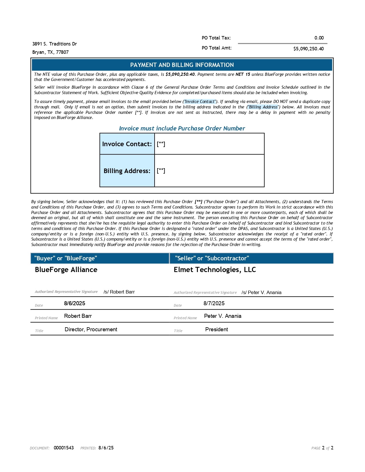 3891 S. Traditions Dr Bryan, TX, 77807 PO Total Tax: PO Total Amt: 0.00 $5,090,250.40 PAYMENT AND BILLING INFORMATION "Invoice Contact" The NTE value of this Purchase Order, plus any applicable taxes, is $ 5 , 090 , 250 . 40 . Payment terms are NET 15 unless BlueForge provides written notice that the Government/Customer has accelerated payments . Seller will invoice BlueForge in accordance with Clause 6 of the General Purchase Order Terms and Conditions and Invoice Schedule outlined in the Subcontractor Statement of Work . Sufficient Objective Quality Evidence for completed/purchased items should also be included when invoicing . To assure timely payment, please email invoices to the email provided below ( ) . If sending via email, please DO NOT send a duplicate copy through mail . Only if email is not an option, then submit invoices to the billing address indicated in the ("Billing Address") below . All invoices must reference the applicable Purchase Order number [**] . If invoices are not sent as instructed, there may be a delay in payment with no penalty imposed on BlueForge Alliance . Invoice must include Purchase Order Number Invoice Contact: [**] Billing Address: [**] By signing below, Seller acknowledges that it : ( 1 ) has reviewed this Purchase Order [**] ("Purchase Order") and all Attachments, ( 2 ) understands the Terms and Conditions of this Purchase Order, and ( 3 ) agrees to such Terms and Conditions . Subcontractor agrees to perform its Work in strict accordance with this Purchase Order and all Attachments . Subcontractor agrees that this Purchase Order may be executed in one or more counterparts, each of which shall be deemed an original, but all of which shall constitute one and the same instrument . The person executing this Purchase Order on behalf of Subcontractor affirmatively represents that she/he has the requisite legal authority to enter this Purchase Order on behalf of Subcontractor and bind Subcontractor to the terms and conditions of this Purchase Order . If this Purchase Order is designated a "rated order" under the DPAS, and Subcontractor is a United States (U . S . ) company/entity or is a foreign (non - U . S . ) entity with U . S . presence, by signing below, Subcontractor acknowledges the receipt of a "rated order" . If Subcontractor is a United States (U . S . ) company/entity or is a foreign (non - U . S . ) entity with U . S . presence and cannot accept the terms of the "rated order", Subcontractor must immediately notify BlueForge and provide reasons for the rejection of the Purchase Order in writing . "Buyer" or "BlueForge" "Seller" or "Subcontractor" BlueForge Alliance Elmet Technologies, LLC Authorized Representative Signature /s/ Peter V. Anania Date Date Printed Name Printed Name Title Title Docusign Envelope ID: DF7F8AAB - 40A7 - 429B - 805A - 6B0007B37CC5 DOCUMENT: 00001543 PRINTED: 8/6/25 PAGE 2 of 2 Robert Barr Director, Procurement Peter V. Anania 8/7/2025 President Authorized Representative Signature 8/6/2025 /s/ Robert Barr